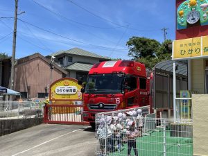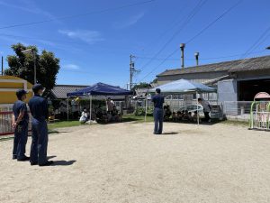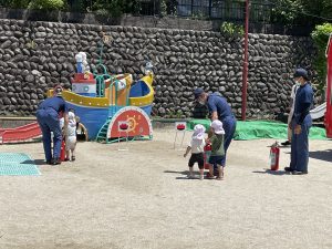 消防士さんのお話を聞いて水消火器を使って火のまとをめがけ、水をかけていました。消防自動車の前で、写真を撮るとうれしかったのか、消防自動車から離れない子もいたりしていました。