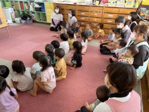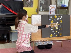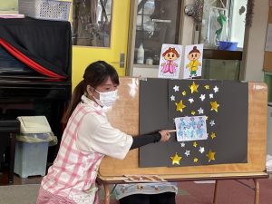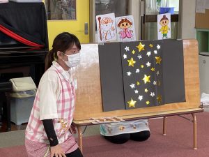 七夕会をしました。先生からペープサートで、彦星さんや織姫さんの話を静かに聞いていました。給食では、星のキュウリが入った七夕そうめんを、みんなでいただきました。