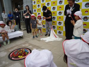 2025年6月12日 瀬戸市のキャラクターマンホールのお披露目式に参加をしました。 瀬戸蔵でおこなわれた、瀬戸市のキャラクターマンホールのお披露目式に、年長さんが参加をしました。 「ポケモン」のキャラクターが描かれた蓋を触ったりしてお祝いをしました。 父兄の皆さんも一度訪ねてください。