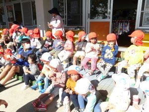 昨日年長さんが掘ってくれた、お芋を園庭で焼いて食べました。