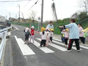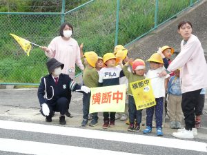 2026年4月13日 交通教室に参加をしました。 交通指導員さんに来ていただき、交通安全教室に参加をしました。 横断歩道の渡り方や、信号機の見方や、道路の歩きを教えていただきました。 みんな、上手にわたっていました。